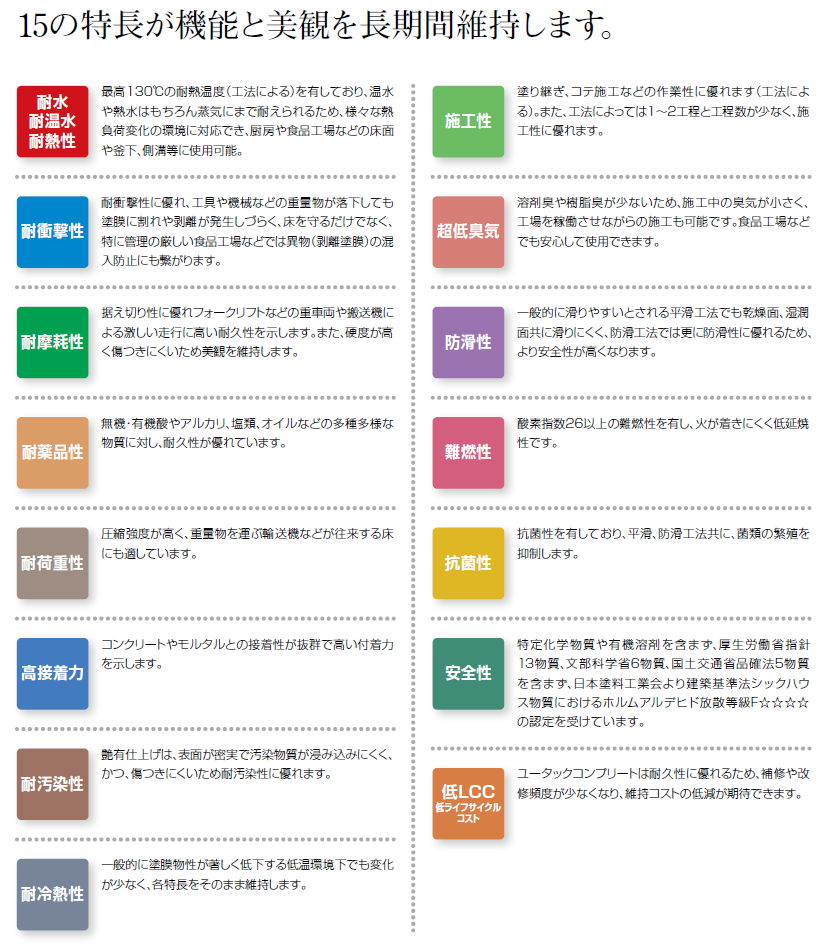 「ユータックコンプリート」シリーズは、ウレア・ウレタン樹脂、セメント、セラミックスを配合した水性硬質ウレタン系塗り床材です。